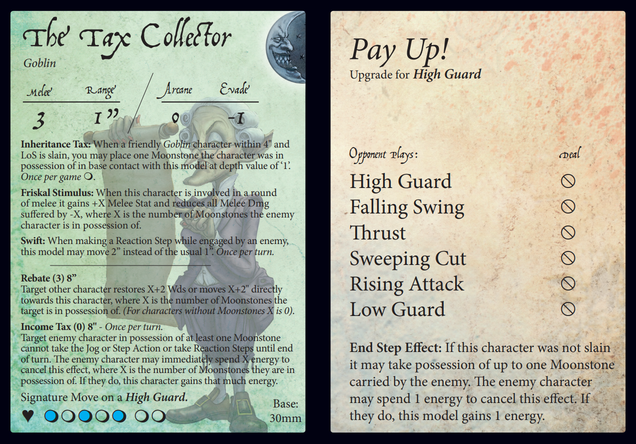 Moonstones are the win condition for a standard game - if you have more than your opponent by the end, you win. Now with the Tax Collector, they're also great for buffing your troupe's movement and toughness as well as sapping the opponent's troupe of energy. 'Rebate' and 'Income Tax' are the Tax Collectors' active abilities that accomplish this. As these are active abilities, they don’t need any cards drawn from the arcane deck and go off automatically. This is always a nice bonus for active abilities but it’s especially useful for the Tax Collector, as she is likely to be targeting moonstone carriers (who are often hiding behind cover), enemies who have good evade, or both.